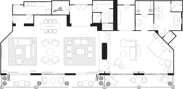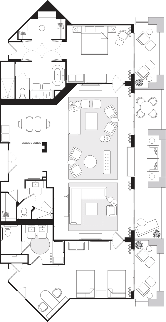 Enjoy the best views of the Princess Pool, lagoon, golf courses and mountains beyond from these inviting suites, which are conveniently located in the main building on the third or fourth floor. Choose one or two separate adjoining bedrooms and relax in a comfortable main parlor with a conference/dining area with a table for six, multiple seating areas, and a large wet bar.