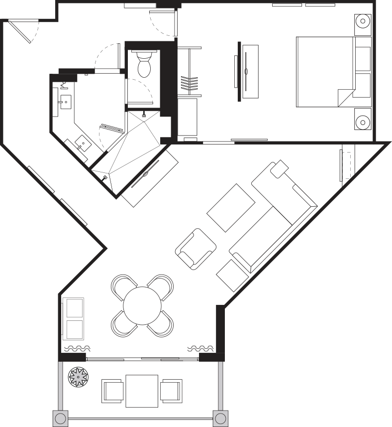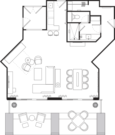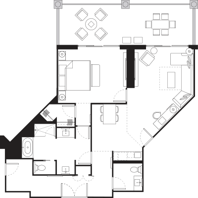 The bedroom offers a quiet retreat all its own with a king bed and 50” HDTV, while the full bathroom feels more like a spa with its double vanities and oversized shower. These accommodations can be expanded with an additional connecting room.